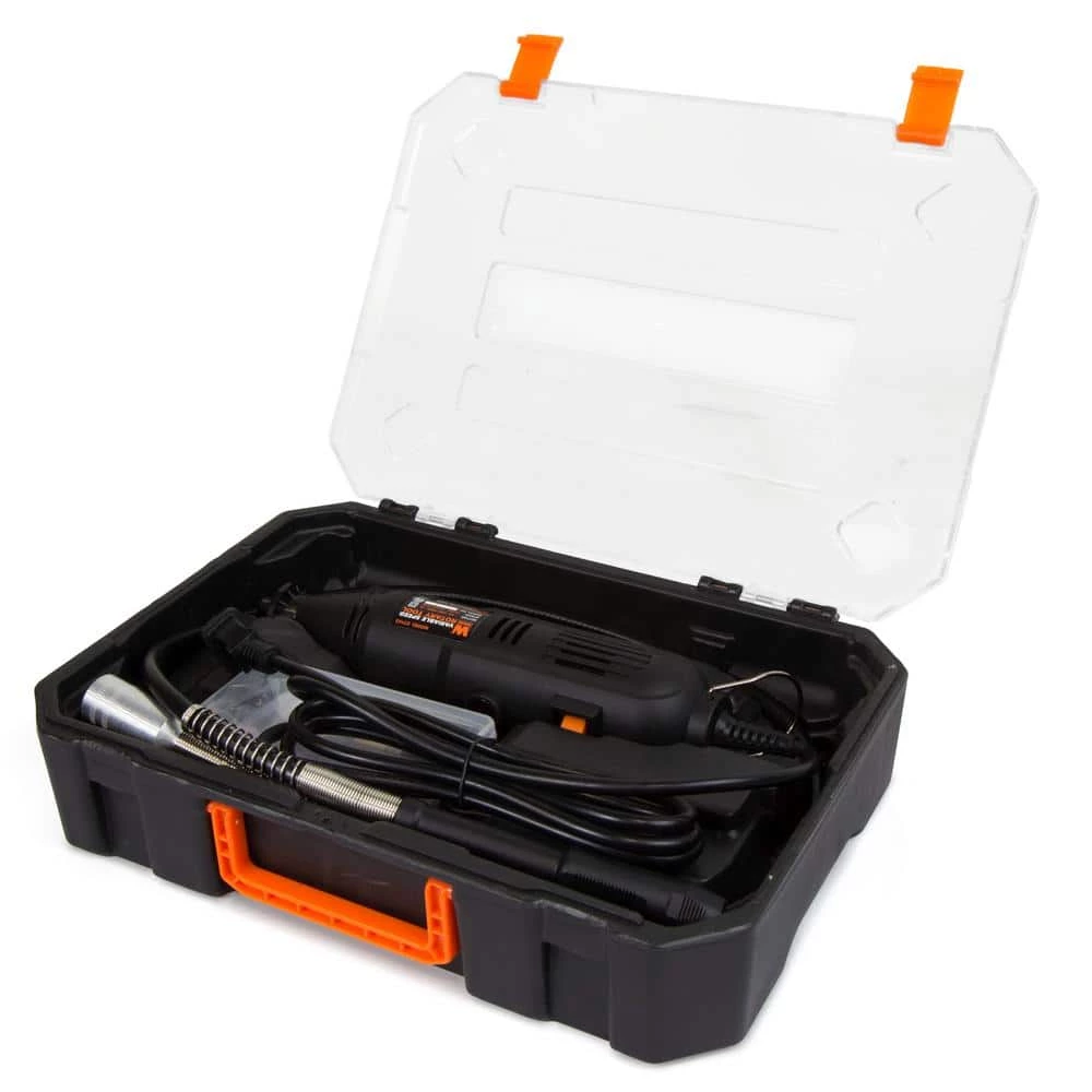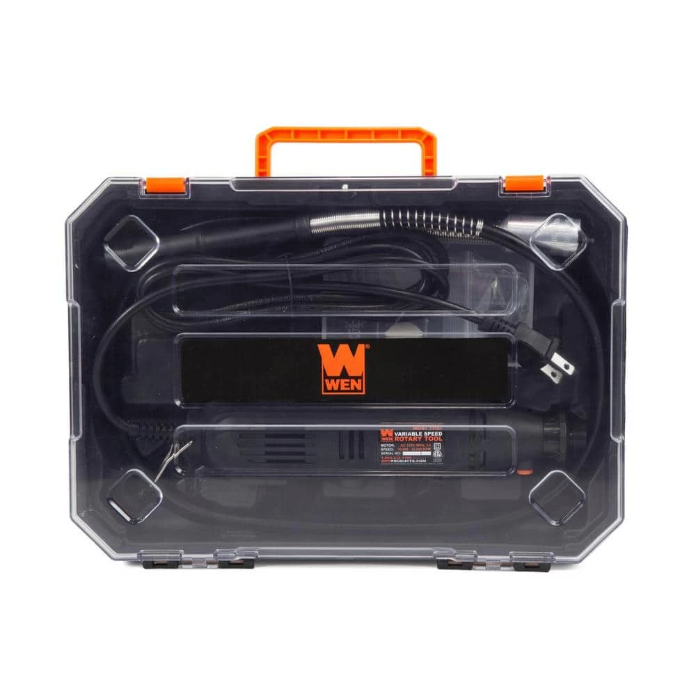 Remember when you had versatility and power all in the palm of your hand. Remove rust from rusty stuff. Trim your dogs toenails. Engrave beautiful images into your neighbors windows while they’re vacationing in Rome. With the WEN Rotary Tool, the possibilities are endless, limited only by your imagination and federal law. Equipped with over 100 accessories, this package provides a wide variety of bits, discs, spindles and more to meet the needs of any project. Easily adjust the variable speed anywhere from 10,000 RPM to 32,000 RPM with the simple turn of the speed dial. The lightweight build combined with the included flex shaft make intricate designs easy to execute. Carve small and complex patterns into glass, plastic, wood, steel, and more. Your WEN 1-Amp Variable Speed Rotary Tool also includes a handy carrying case for simple storage and transportation between jobs. And, because its a WEN product, your rotary tool comes Backed by a 2-year warranty, a robust inventory of replacement parts, and a friendly customer help line, all to make sure you remember WEN.