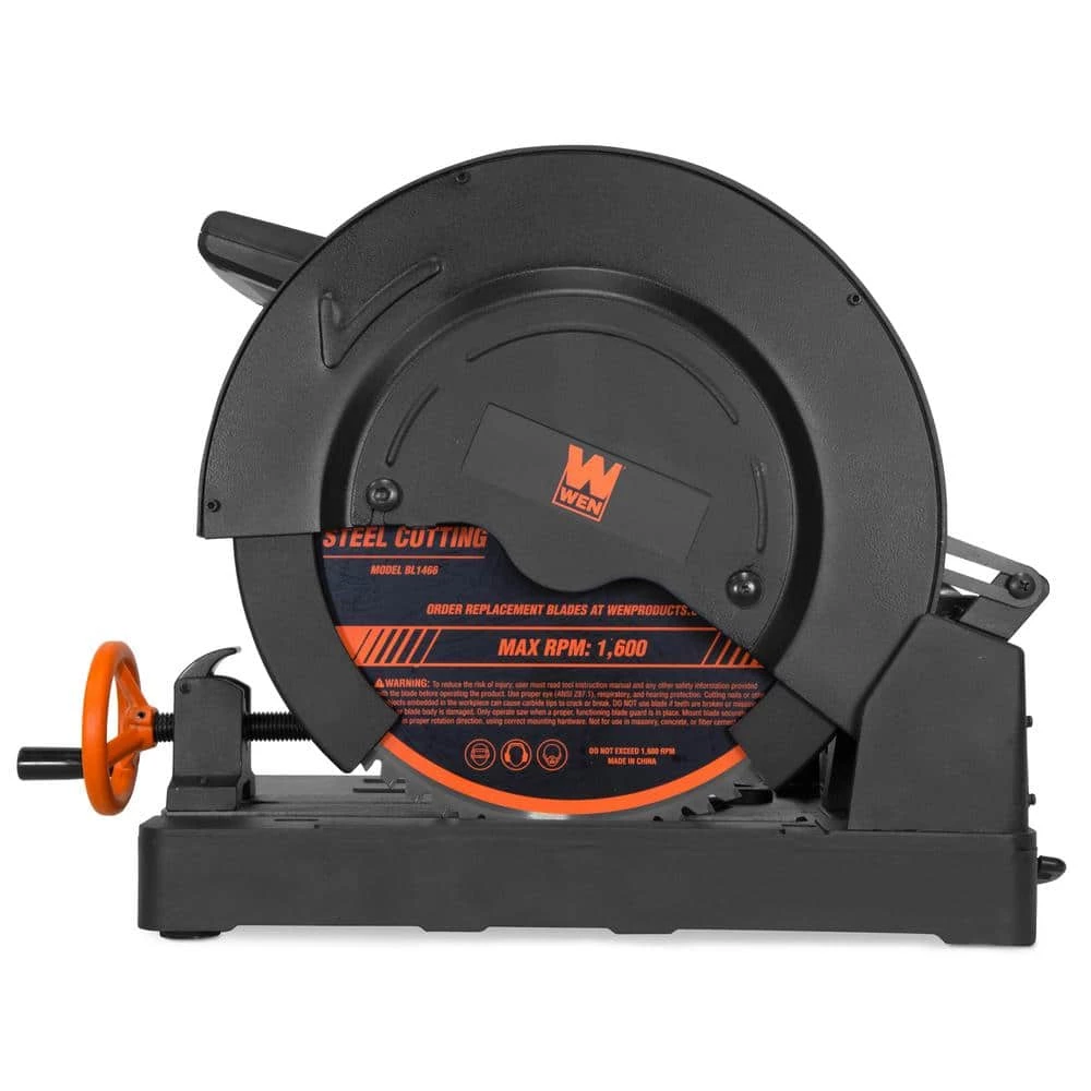 Remember when you could saw through anything. Take on ferrous and non-ferrous metals alike with the WEN 15 Amp Heavy-Duty Premium Chop Saw. This top-of-the-line chop saw features a precision-machined heavy-duty cast aluminum base, helping to limit vibration while providing smooth and even support to your workpiece. Take on steel plates up to 0.5 in. thick, rectangular tubes up to 3.75 by 7.25 inches in size (3.125 in. to 4.375 in. at 45°), and round tubes up to 5.125 in. size (4.125 in. at 45°). The powerful 15 Amp motor rotates the included 66-tooth carbide-tipped professional mild steel blade up to 1450-times per minute (saw blade model BL1466). The onboard workpiece vise includes a quick-release locking knob to help improve efficiency and productivity during repetitive sawing jobs. The adjustable fence pivots up to 45° for mitered cuts while the optional round workpiece holder helps tightly secure pipes and other cylindrical workpieces. The plunge lock keeps the saw locked in the downward position for easy transportation and storage between uses. The removable dust bin collects metal shavings and wood dust. Combine that with the included 1.5 in. dust port to make clean up a breeze. And because it’s a WEN product, your chop saw comes backed by a 2-year warranty, a stocked inventory of replacement parts, and a friendly customer help line, all to make sure you remember WEN.