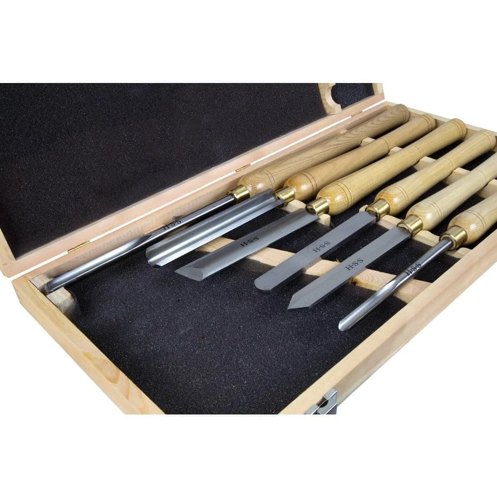 - Includes a roughing gouge, 2 spindle gouges, an oval skew, a round-nose scraper and a diamond parting tool