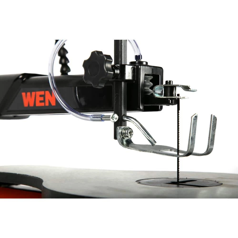 Remember when you could make intricate and artful cuts? Let the good times scroll with the WEN 16 in. Variable Speed Scroll Saw. The 9/16 in. stroke saws through hard woods up to 2 in. thick. Adjust the speed anywhere from 550 to 1600 strokes per minute with the simple turn of a knob. The cast iron base prevents vibration and walking during operation while the spacious 16.25 in. x 10 in. table bevels up to 45° for angled cuts. The saw also includes a hold-down foot clamp for securing your project in place along with a flexible work light that bends and adjusts to whatever position your heart desires. The adjustable air pump clears sawdust from your work area to give you a clear line of vision. This combined with the 1-1/2 in. dust port keeps your work area clean so you can focus on your woodworking. There’s no need to fret about blade changes – the included blade holder accepts pinned, pinless, and spiral blades while the unique side panel swings open for easy access to the bottom blade holder. This package includes one 15 TPI pinned blade, one 18 TPI pinned blade, and one 18 TPI pinless blade. And because it’s a WEN product, your scroll saw comes backed by a 2-year warranty, a stocked inventory of replacement parts, and a friendly customer help line, all to make sure you remember WEN.