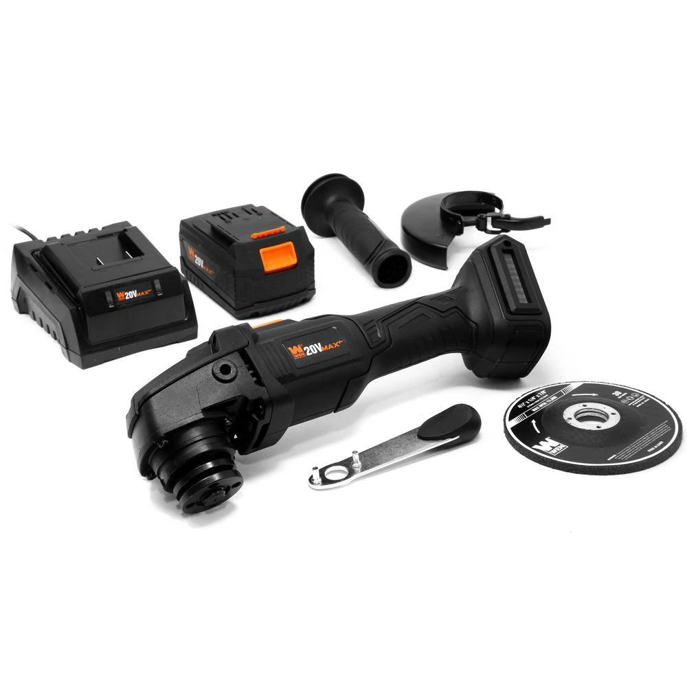 Remember when you weren’t bound by cords. Get your grind on with the WEN 20-Volt maximum Brushless Cordless Angle Grinder. Power through rust, chains, pipes and more. Clocking in at up to 8500 RPM, this grinder features a brushless motor for more runtime, better performance, and less maintenance than brushed alternatives. Our lightweight design weighs in at a mere 5 lbs. to limit fatigue during long days on the grind. The lock-on power switch snaps into place to keep the machine running without constantly holding your thumb down on the trigger. The detachable auxiliary side handle can be positioned on the right side, the left side, or on top of the grinder, depending on your preference. The 5/8 in.-11 spindle accepts the majority of 4.5 in. grinding wheels on the market. The included 4.0 amp-hour lithium-ion battery provides consistently powerful performance at any level of charge, includes an onboard LED charge gauge, and is cross-compatible with the entire WEN 20-Volt maximum Lithium-Ion Cordless Power Tool line. This powerful grinder comes packed with accessories, including a 4-1/2 in. 30-grit grinding wheel, a 3-position auxiliary side handle, a tool-free quick-adjust wheel guard, a spindle lock for easy accessory changes, and a 2 Amp battery charger. And, because it’s a WEN product, your 4-1/2 in. brushless angle grinder comes backed by a 2-year warranty, a stocked inventory of replacement parts, and a friendly customer phone line, all to make sure you remember WEN.