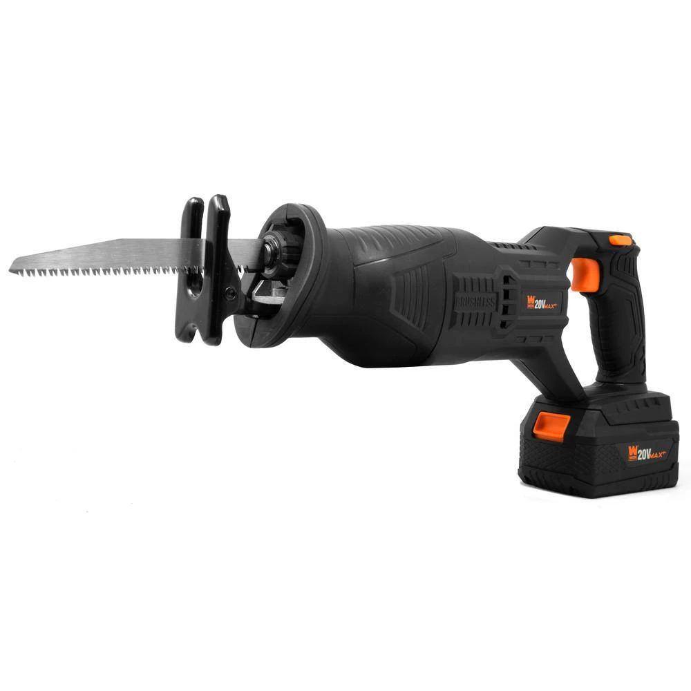 Remember when you could saw through wood, metal, drywall, rubber, plastics, plaster and more. The WEN 20-Volt maximum Cordless Recip Saw makes easy work out of a variety of materials. The variable-pressure trigger provides a 1 in. stroke up to 2800 times per minute, depending on how hard it is pressed. The brushless motor provides more runtime and better performance, and lasts longer with less maintenance than brushed alternatives. Take on wood up to 4.5 in. thick and metal up to 0.4 in. thick. The adjustable shoe helps provide additional support. The lightweight, ergonomic design features a soft-grip front handle, contoured to fit your hand for maximum comfort and control during operation. The twist-lock quick-release blade holder allows for easy tool-free blade changes, and accepts standard reciprocating saw blades. The included 4.0 amp-hour lithium-ion battery delivers consistently powerful performance at any level of charge, features an onboard LED charge gauge, and is cross-compatible with the entire WEN 20-Volt maximum Lithium-Ion Cordless Power Tool line. This package also includes a wood saw blade, a metal saw blade, and a 2 Amp battery charger. And because it’s a WEN product, your reciprocating saw comes backed by a 2-year warranty, a stocked inventory of replacement parts, and a friendly customer help line, all to make sure you remember WEN.