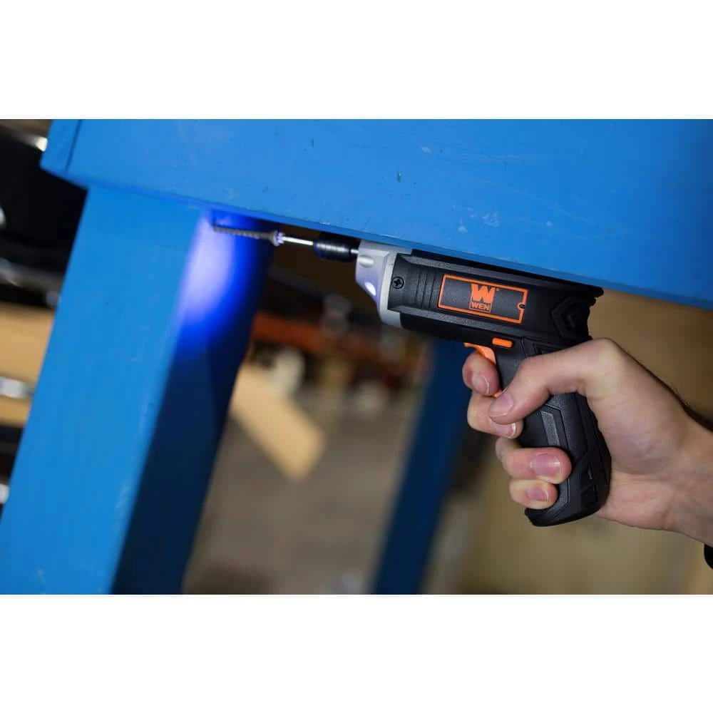 The WEN 3.6-Volt Lithium-Ion Cordless Screwdriver with Bits and Belt Holster provides compact and portable power helpful to any homeowner. The quick release 1/4 in. chuck rests flush against the top of the driver to allow access to tight corners and awkward spaces. This drivers unique design makes it the perfect companion for putting together furniture and accessing hard to reach screws. Drive screws and fasteners at a rate of 180 rotations per minute with up to 31 in lbs of torque. The battery’s lithium-ion cells create a fade-free power supply for hours of steady and consistent operation. An onboard battery meter informs users when their power supply is running low and in need of a charge. Two LED lights at the front of the drill illuminate your workpiece during operation. The lightweight design weighs in at a mere 12 oz. while the soft rubber-backed handle features ergonomic contours that fit perfectly into the palm of your hand. This package includes a convenient carrying holster with bit storage, two flat head bits, one phillips head bit, and a charger. And, because its a WEN product, your screwdriver comes backed by a nationwide network of skilled service technicians, a friendly customer help line and a two year warranty all to make sure you remember WEN.