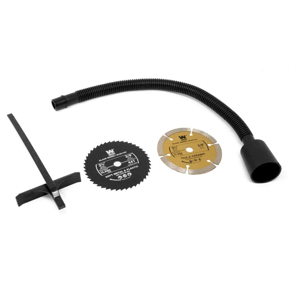 - Includes an HSS metal-cutting blade, a diamond-coated tile-cutting blade, a carbide-tipped wood cutting blade, a carrying case, a dust extraction tube, a rip-guide fence, and a 2-year warranty