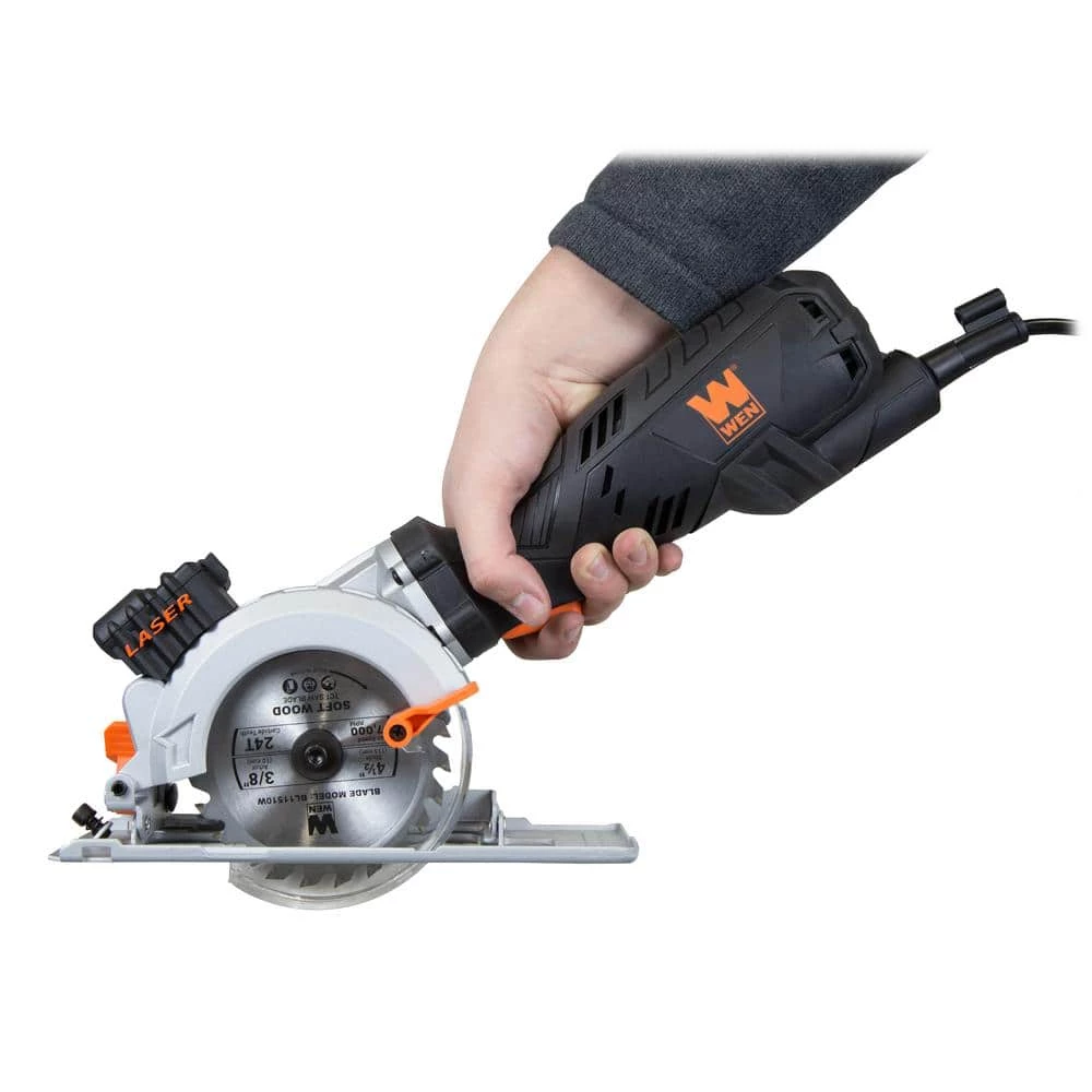 Remember when you could make cuts quickly and easily. The WEN 5 Amp 4-1/2 in. Mini Circular Saw provides versatile and powerful performance all in the palm of your hand. Perfect for wood, drywall, tile, sheet metal, pipes, and more. Its compact design weighs in at a mere 5.1 lbs., limiting fatigue during operation and making for easy storage between jobs. The 5 Amp motor provides maximum torque, spinning the 4-1/2 in. blade (115 mm, 10 mm arbor) up to 3500 RPM. Attack boards up to 1-11/16 in. in thickness or bevel the baseplate for 45 angled cuts in workpieces up to 1-1/8 in. thick. Your WEN Compact Circular Saw also comes packed with accessories, including a 24-tooth carbide-tipped wood-cutting blade, a dust extraction tube, and a convenient blow-mold carrying case, complete with storage compartments for all your accessories. And, because its a WEN product, your handheld circular saw comes backed by a nationwide network of skilled service technicians, a friendly customer help line and a 2-year warranty, all to make sure you remember WEN.