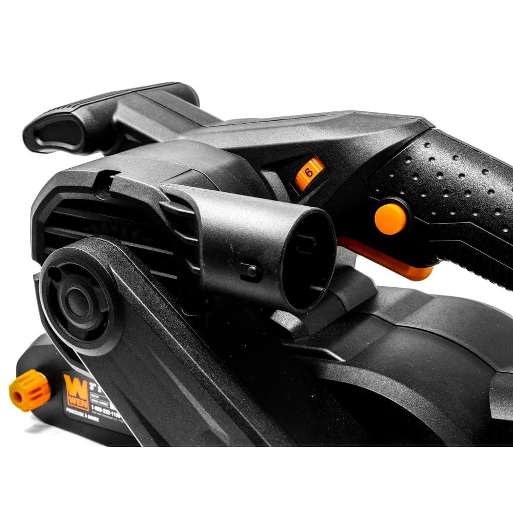 Remember when you needed a versatile and reliable sander. Smooth out surfaces, deburr jagged edges, strip paint, and more with the WEN 3 in. x 18 in. Belt Sander. Our 6.3 Amp variable speed motor runs the included 80-grit sanding belt anywhere between 420 ft. to 850 ft. per-minute, making easy work out of even the toughest surfaces. The lightweight 6.3 lbs. body makes for a reliable and ergonomic handheld belt sander. The front roller extends past the top edge of the housing, allowing the belt to reach and sand even the tightest of corners. The lock-on power switch keeps your sander sanding without having to keep any buttons held down. The onboard 1-1/4 in. dust port (with 1-7/16 in. O.D.) can be attached to either the dust hose of your choice or the included dust bag. And because it’s a WEN product, your portable belt sander comes backed by a 2-year warranty, a stocked inventory of replacement parts, and a friendly customer helpline, all to make sure you remember WEN.