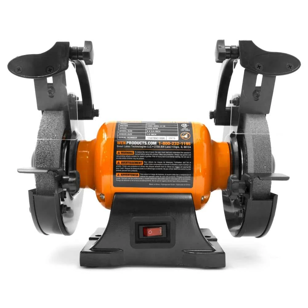 Remember when you spent all that money replacing dull rusty tools. From deburring ragged edges to cleaning objects to sharpening blades, the WEN 6 in. Bench Grinder helps resuscitate old worn down knives, tools and bits, saving you time and money. Our package includes two 6 in. x 3/4 in. wheels with 1/2 in. arbors: a 60-grit wheel for general purpose grinding and a coarse 36-grit wheel for faster material removal. With our quiet 2.1 Amp motor, expect quick startups and smooth performance at speeds of up to 3450 rotations per minute. Built with you in mind, our design makes wheel guard removal as simple as possible for easy wheel changes. Adjustable work rests pivot to allow for angled grinding applications. And because its a WEN product, your 6 in. Bench Grinder comes backed by a 2-year warranty, a stocked inventory of replacement parts and a friendly customer phone line. No need to waste anymore money on new tools. The WEN 6 in. Bench Grinder revives all of your tools back to their sharp original state. Remember when your blades could actually cut through something. Remember WEN.
