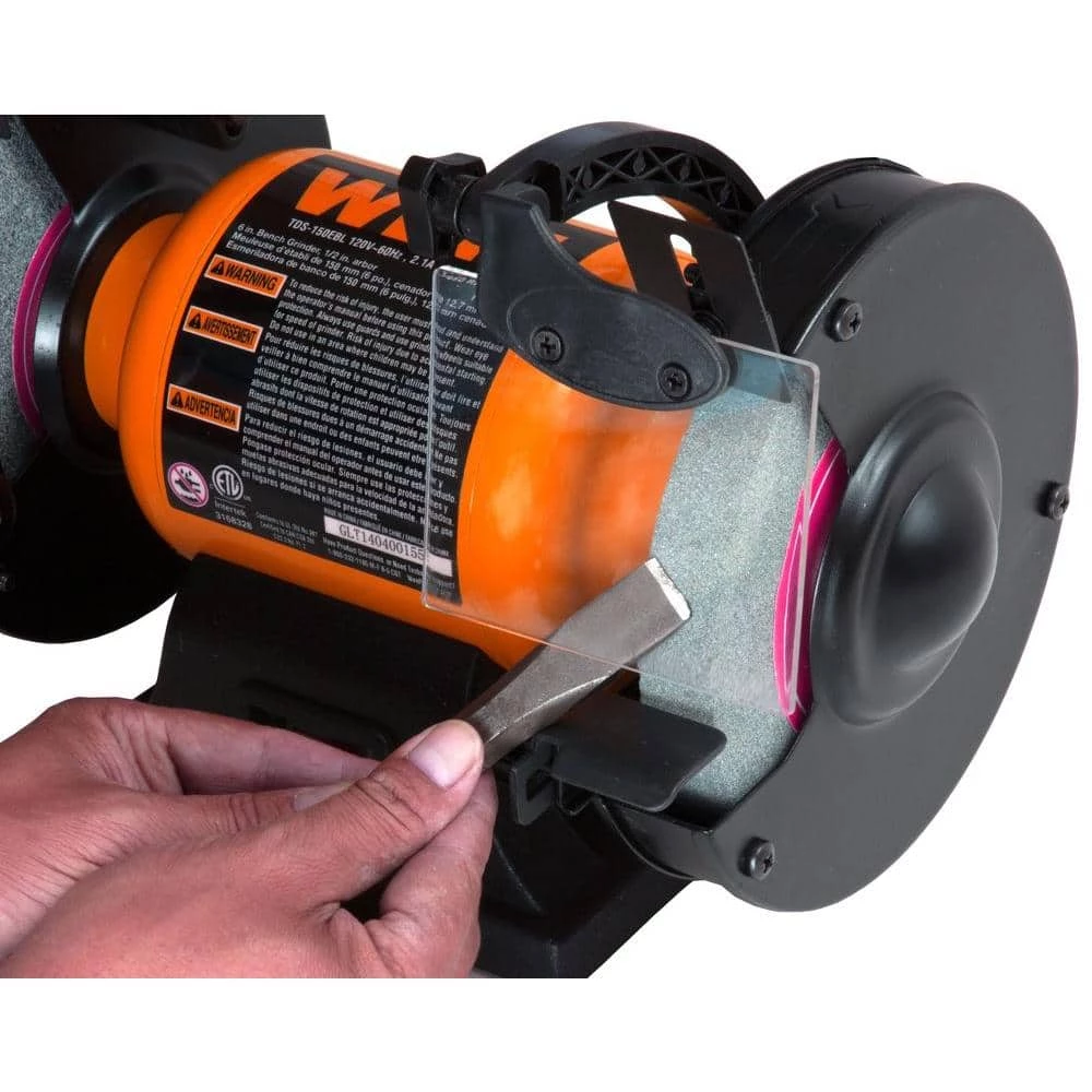 Remember when you spent all that money replacing dull rusty tools. It’s time to get your grind on with the WEN 6 in. Bench Grinder. From deburring ragged edges to cleaning objects to sharpening blades, this bench grinder helps resuscitate old worn down knives, tools and bits, saving you time and money. Our package includes two 6 in. x 3/4 in. wheels with 1/2 in. arbors: a 60-grit wheel for general purpose grinding and a coarse 36-grit wheel for faster material removal. With our quiet 2.1 Amp motor, expect quick startups and smooth performance at speeds of up to 3450 rotations per minute. Built with you in mind, our design makes wheel guard removal as simple as possible for easy wheel changes. The included flexible work light illuminates your workpiece during operation. Adjustable work rests pivot to allow for angled grinding applications. And because its a WEN product, your 6 in. Bench Grinder comes backed by a 2-year warranty, a stocked inventory of replacement parts and a friendly customer phone line. No need to waste anymore money on new tools. The WEN 6 in. Bench Grinder revives all of your tools back to their sharp original state. Remember when your blades could actually cut through something. Remember WEN.