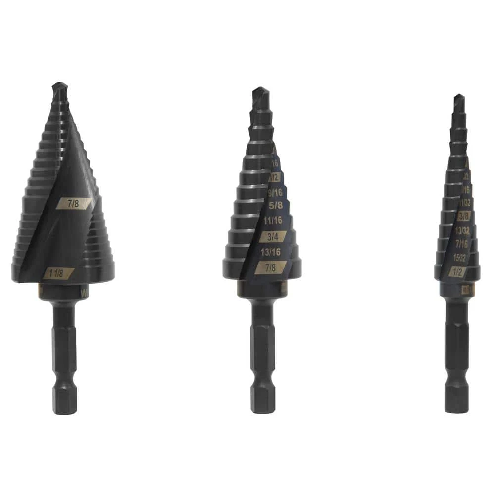 - Includes a #1 drill bit with 13 steps ranging from 1/8 in. to 1/2 in. Dia, a #4 drill bit with 12 steps ranging from 3/16 in. to 7/8 in., and one #9 drill bit with 20 steps ranging from 3/16 in. to 1-1/8 in.