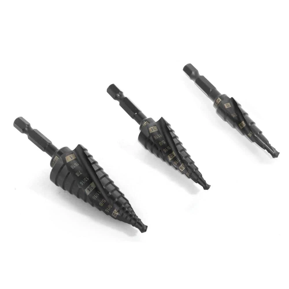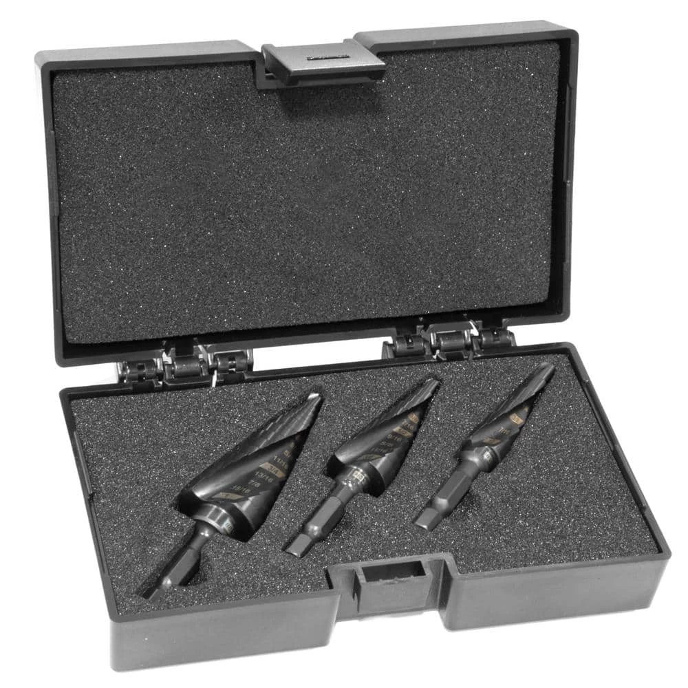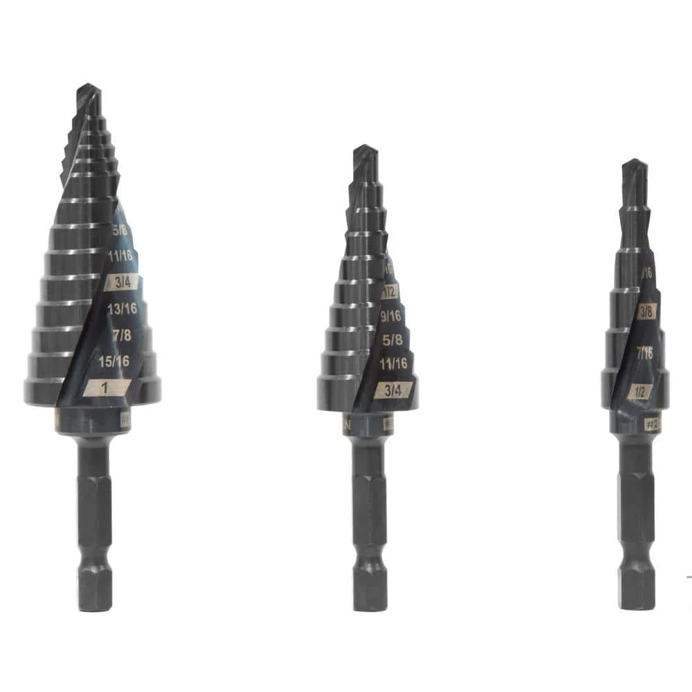 - Includes a #2 drill bit with 6 steps ranging from 3/16 in. to 1/2 in., a #3 drill bit with 10 steps ranging from 3/16 in. to 3/4 in., and a #8 drill bit with 14 steps ranging from 3/16 in. to 1 in.