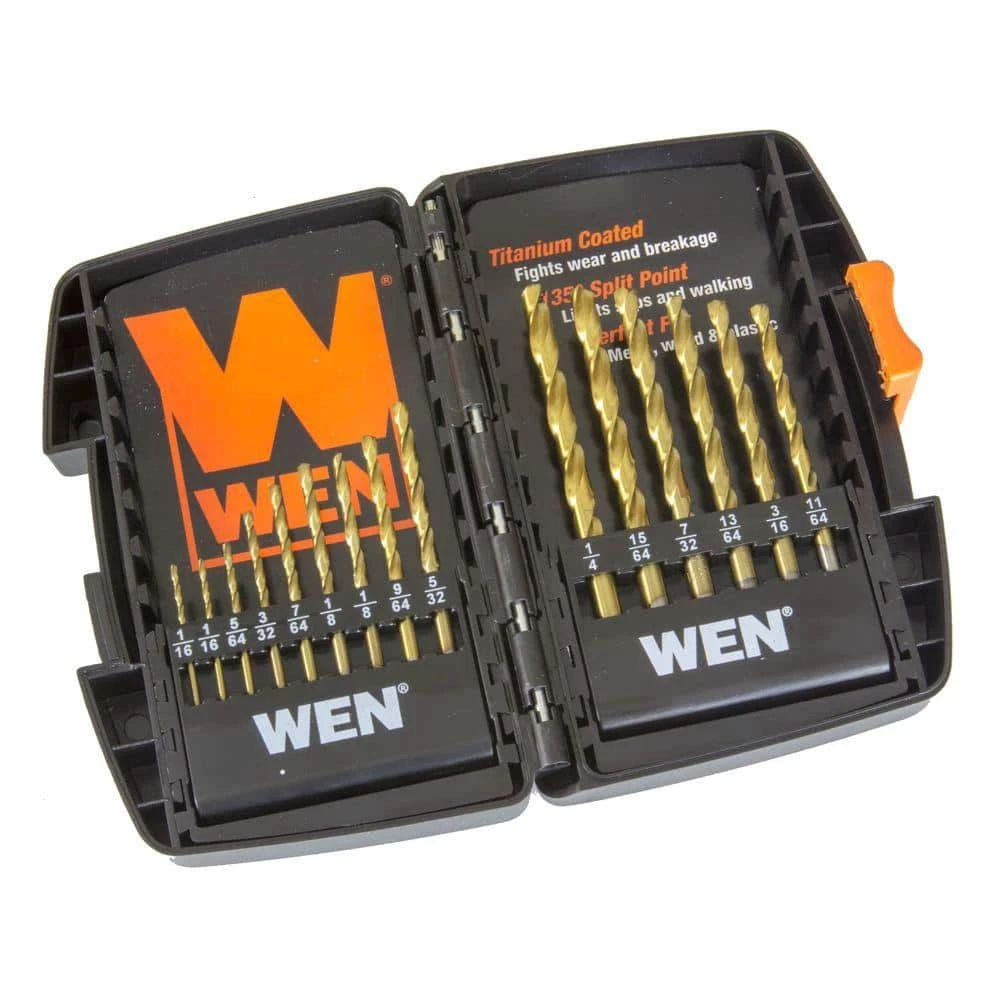 The WEN 15-Piece titanium-coated drill bit set includes a variety of reliable bits for all of your drilling needs. The titanium coating maximizes the lifespan of your bits by fighting wear and breakage while the 135° split points limit slips and walking. Sizes range from 1/16 of an inch all the way up to 1/4 of an inch in 1/64 in. Intervals. The uniquely shaped base provides a sturdy grip for drill chucks, preventing the bits from slipping or spinning during application. Perfect for making clean holes in metals, woods and plastics. Includes a compact carrying case for convenient storage and transport.